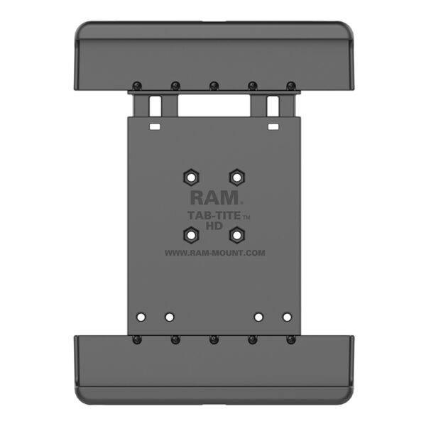 The RAM Tab-Tite spring loaded, quick release cradle offers a secure fit with easy access to the mounted tablet. The interchangeable cup ends are designed specifically for the Samsung Galaxy Tab 4 10.1 and Tab S 10.5. The spring loaded design makes it easy to insert and remove your tablet, along with keeping it secure in mobile applications. The custom end cups are designed to optimize the functionality of your tablet, enabling access to all ports and tablet functions. The included back plate is interchangeable with various size support cups, making it compatible with numerous tablet models. New detachable support cups are the only components needed for purchase, attach to the back plate for support of your new tablet. Included is a set of four nuts and bolts to connect the cradle to any RAM components or mounts that contain the universal AMPs hole pattern. For off-road environments and extreme use, we recommended the use of a tether to assist in retaining your device. The Tab-Tite cradle is compatible with any tablet that will fit the dimensions listed below. It is important to verify the dimensions of your tablet when determining the overall size.