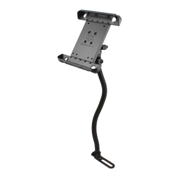 The RAM-B-316-1-TAB3 consists of the RAM POD I universal No-Drill vehicle base, 18 rigid aluminum rod, socket system and Tab-Tite universal clamping cradle. The base of the mount connects to your seat rail without any drilling necessary. The 18″ rigid aluminum rod can be bent to position your device to its optimum viewing location. The spring loaded, quick release Tab-Tite cradle makes it easy to load and unload your tablet, along with keeping it secure while on the go. Cup ends are designed to optimize the functionality of your tablet, allowing access to audio jacks, usb, power, and other ports, your iPad can be used just as it was intended. The included backplate is interchangeable with various size support cups, making it compatible with numerous tablet models. New detachable support cups are the only components needed for purchase, attach to the backplate for support of your new tablet. The Tab-Tite cradle is compatible with any tablet that will fit the dimensions listed below. It is important to verify the dimensions of your tablet when determining the overall size.