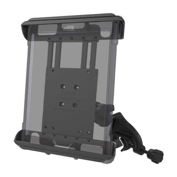 The RAM-B-121-TAB8U consists of a yoke clamp base, double socket arm, round base adapter and Tab-Tite universal clamping cradle. The mount is designed with a RAM 1″ diameter patented rubber ball and socket system that has adjustment points at both ends of the double socket arm; this allowing for almost infinite adjustment and perfect viewing angles. The included Tab-Tite cradle includes a spring loaded back plate and custom support cups for 10″ screen tablets WITH heavy duty cases. The spring loaded design makes it easy to load and unload your tablet, along with keeping it secure while on the go. Interchangeable cup ends are designed to optimize the functionality of your tablet, allowing access to audio jacks, usb, power, and other ports, your tablet can be used just as it was intended. The Tab-Tite cradle is compatible with any tablet that will fit the dimensions listed below. It is important to verify the dimensions of your tablet when determining the overall size.