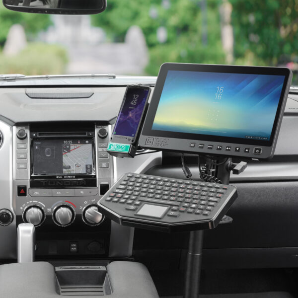 This in-vehicle GDS View monitor and GDS Keyboard mount features a RAM Tele-Pole 5 base, RAM Tele-Pole 4 upper pole with flange, 6 swing arm, and a long C size double socket arm. Easily connect your GDS Keyboard to the swing arm, and attach the GDS View monitor to the flange and double socket arm via the included ball bases. With the ability to swing the keyboard out of the way when not in use as well as position the monitor at nearly any angle, ensure your mobile workstation is backed by RAM Mounts for strength, durability, and versatility.