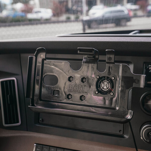 This RAM EZ-Roll’r cradle is designed specifically to support the Samsung Galaxy Tab Active5, Tab Active3, 2, and any Samsung 8″ tablet with the RAM Tough-Case. The patented RAM EZ-Roll’r design allows you to easily insert the tablet into the holder while keeping it secured in place while on the road. This holder comes with a built-in cooling fan to prevent overheating of the tablet for long term use. Optional tie-down points are integrated into the holder to allow additional strain relief of the RAM Tough-Case coiled cable. Get the Heat Out! with RAM Tough-Case.