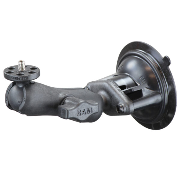 The RAP-B-224-1-366 consists of a 3.3″ suction cup twist lock base, high strength composite double socket arm and 1″ ball, connected to a round plate with 1/4″-20 camera thread. The suction cup base is designed to have a strong hold on glass and non-porous plastic surfaces, including RAM adhesive disks. The male 1/4″-20 threaded steel stud will connect to any standard female thread found on camcorders, digital cameras and POV cameras. The mount is designed with a RAM 1″ diameter patented rubber ball and socket system that has adjustment points at both ends of the double socket arm; this allowing for almost infinite adjustment and perfect viewing angles.