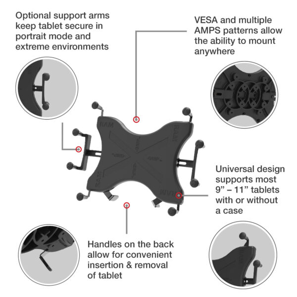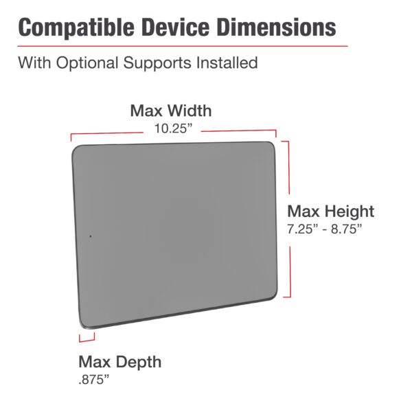 This vehicle bundle consists of the RAM No-Drill mounting system and the RAM X-Grip universal holder for 12″ tablets. Designed to install quickly and easily into a range of vehicles using the existing hardware of the passenger side seat rails. This configuration provides a telescoping feature that ranges from 12 to 18. Dual swing arms provide articulation and 12 of reach for passenger and driver access to the mounted device. The RAM X-Grip features an ‘X’ design that expands and contracts to provide a perfect fit for your device even if it’s in a case. Included are easy access grip knobs located on the back of the cradle for quick release of your tablet. This version of the RAM X-Grip holder is compatible with tablets that will fit the dimensions listed below. It is important to verify the dimensions of device with its case, sleeve, or skin when determining the overall size.