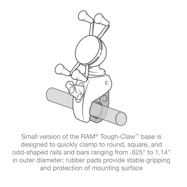 • Small version of the RAM® Tough-Claw™ base is designed to quickly clamp to round, square, and odd-shaped rails and bars ranging from .625" to 1.14" in outer diameter; rubber pads provide stable gripping and protection of mounting surface